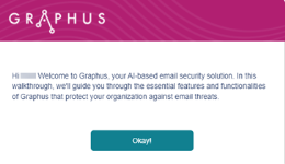 - Welcome announcement: When a new global admin logs into Graphus, they are greeted with a Welcome announcement and can begin the onboarding walkthroughs.