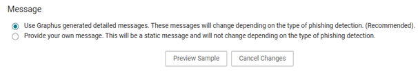 - In the Message section, Use Graphus generated detailed messages is selected by default. Therefore, the banner content will automatically update to describe the type of phishing that is detected. With the Provide your own message option, you can provide your own custom banner content in the text box that will be displayed. When this option is selected, the banner content is static (will not change based on the phishing type that is detected).