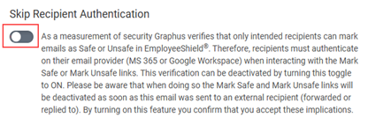 - With the Skip Recipient Authentication option, you can control whether recipients are required to authenticate to interact with the EmployeeShield® banner. By default, the option is disabled, meaning email recipients must authenticate on their email provider before being allowed to interact with the banner.