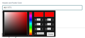 Click inside the text box to display the color palette. Select a color by dragging the dot inside the square to a specific location. Also, you can drag the slider bar up or down to move between hues of different colors. Alternatively, you can manually enter the color code. When you click Done, the selected color’s code appears in the textbox.![]()