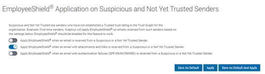 - Apply EmployeeShield® when an email is received from a Suspicious or a Not Yet Trusted Sender: Graphus will apply EmployeeShield® on an email from such senders. If you enable this setting, the other two are covered by default.