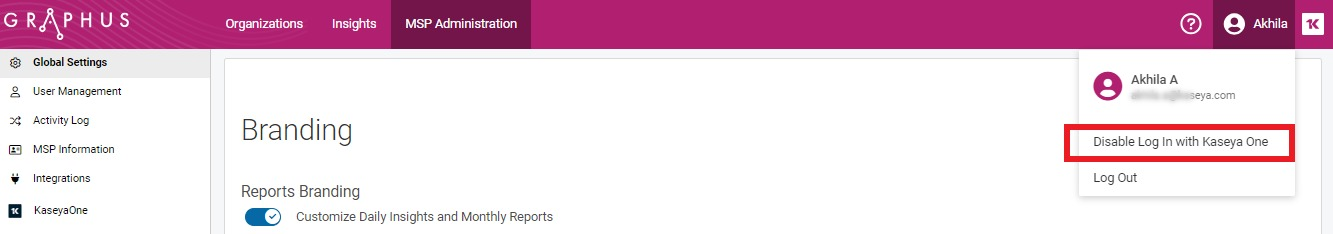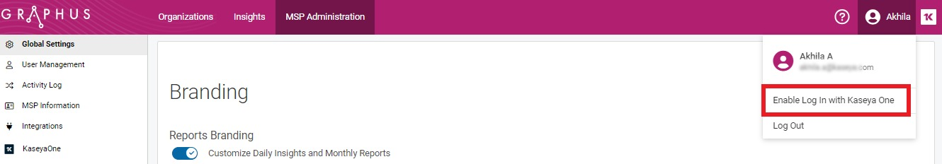- You can map your local Graphus account email address with your KaseyaOne account email address by clicking Enable Login with KaseyaOne in your Graphus profile.