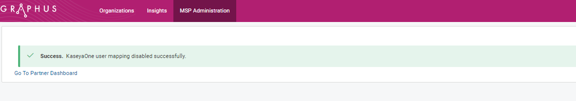 Once you are logged in, you will be redirected to the Graphus portal. A message is displayed indicating that Log in with KaseyaOne was successfully enabled.