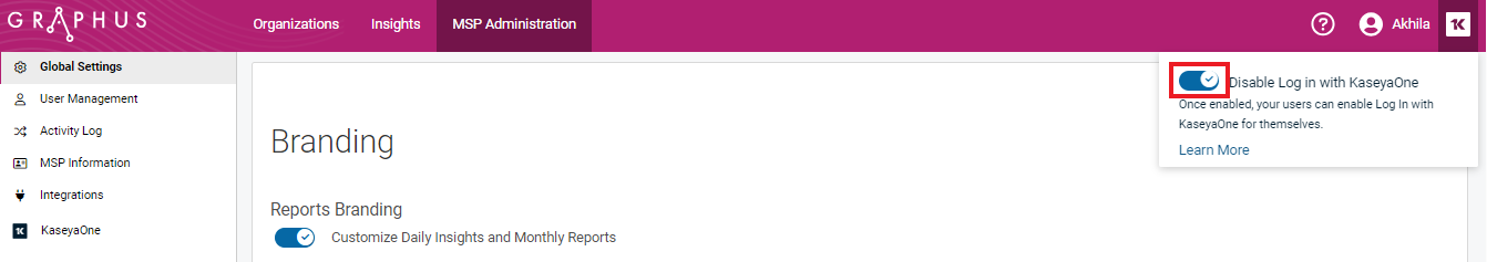 Only a Graphus admin and KaseyaOne Master user can enable KaseyaOne unified login for their company.