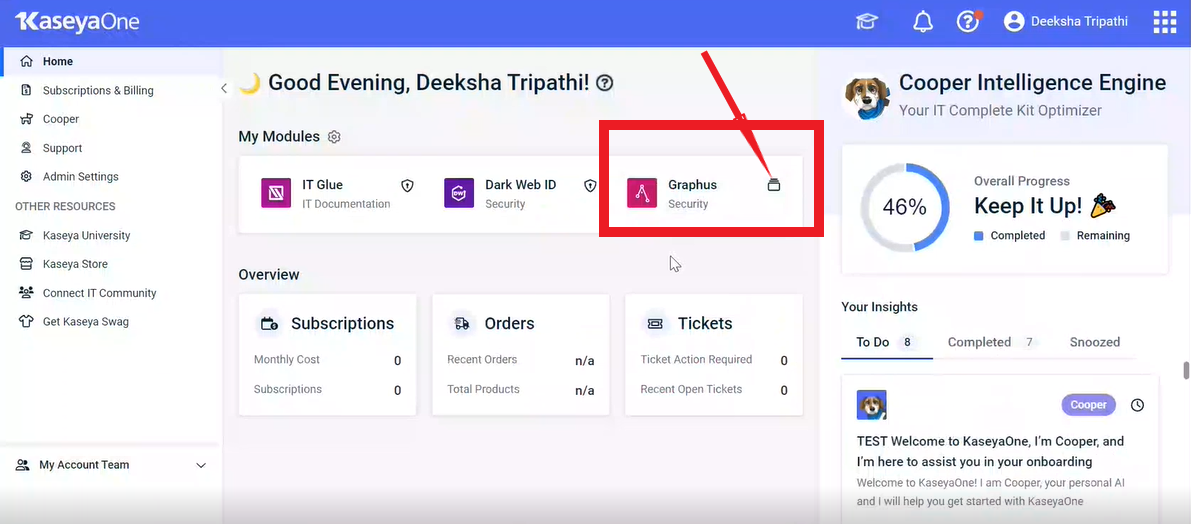 Once a user is verified, the user is logged into the Graphus portal via KaseyaOne credentials with all Graphus local user rights. Your users will also be able to see the KaseyaOne Launchpad which allows them to sign in to other KaseyaOne IT Complete products that have unified login set up.