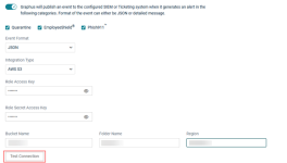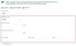 Publishing an event to a SIEM or ticketing system requires that you select from the following integration types: AWS S3, Splunk, ConnectWise, or BMS. The table below describes the information you must provide for each type to complete the integration.