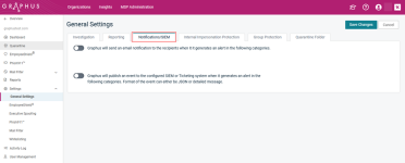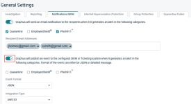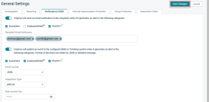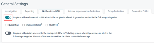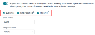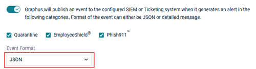 Graphus will publish an event to the configured SIEM or ticketing system when it generates an alert for the categories you have selected. You can select more than one category.