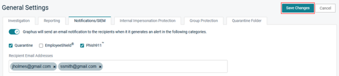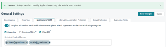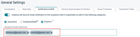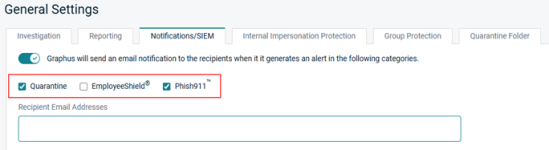 Graphus will send an email notification to specified recipients when an alert is generated for a category you have selected. You can select more than one category. For example, if Quarantine is selected, an email notification will be sent to the specified recipients whenever an email is quarantined.