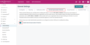 To enable this feature for an organization, in the navigation pane select Settings > General Settings. Click the Internal Impersonation Protection tab and click the toggle to enable it. Click Save Changes.![]()