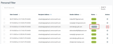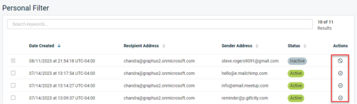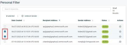 The Personal Filter page lists all senders that have been marked by any individual recipient. Senders with the Active status have been marked as spam and are actively blocked by Graphus. Senders with the Inactive status were either marked as Not a Spam Sender via the banner, or the recipient reversed a marking by using the Unblock link on an already blocked email. MSP admins have the ability to unblock or block senders for one or more recipients. When a sender is unblocked, the status will change to Inactive, and the recipient will start to receive emails again from this sender.