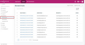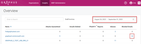 On the Insights Overview page, the Blocked Emails column displays the number of emails that have been blocked for each organization during the time period selected. The hyperlink redirects you to the Blocked Emails page.