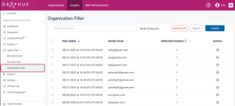 - Click Import. Each imported sender email address is listed in the Organization Filter table.