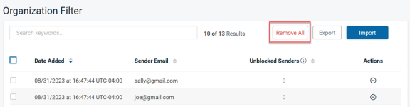 The Organization Filter allows administrators to manage a list of senders to block at the organization level. This filter applies to all email recipients in the organization. Meaning, that all emails sent from the addresses configured in the filter are blocked globally.
