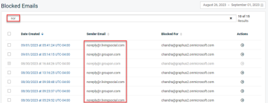 - In the Search box, you can search by Sender Email or Blocked For values. Enter a single element only and press Enter. Entering partial values will return all records that include the value you entered.