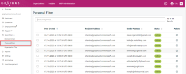 Prerequisite: The Personal Filter and/or Organization Filter must be set up by the admin prior to managing the Personal Spam Filter. See the article Setting up the Personal Spam Filter for graymail filtering.