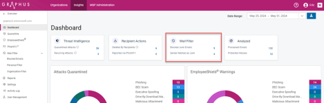 On the organization's Dashboard, the Mail Filter card displays the following statistics: