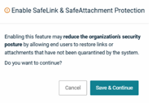 If you decide you don't want to allow users to restore links and attachments, click Cancel. To allow restoration, click Save & Continue. This provides a restoration link in quarantined emails.