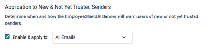 - For a banner to be displayed on emails from new or not yet trusted senders, in the Application to New & Not Yet Trusted Senders section, verify the Enable & apply to check box is selected. It is recommended that All Emails be selected in the list.