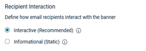 - In the Recipient Interaction section, Interactive is pre-selected. The banner will appear with interactive links allowing recipients to report an email as Phishing (Unsafe) or False Positive (Safe). If you select Informational, the banner will only provide information and there will not be any interactive links available to the recipients.