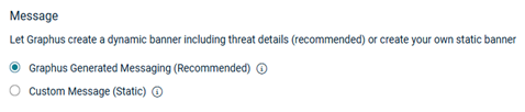 - In the Message section, with Graphus Generated Messaging (Recommended) selected, the banner content will automatically update to describe the type of phishing that is detected. With the Custom Message (Static) option, you can provide your own custom banner content in the text box that will be displayed. The content will not change based on the phishing type that is detected.