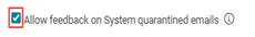 - To allow email recipients to provide feedback in the EmployeeShield banner for emails Graphus has flagged as potentially malicious and therefore has quarantined, select the Allow feedback on System quarantined emails check box.