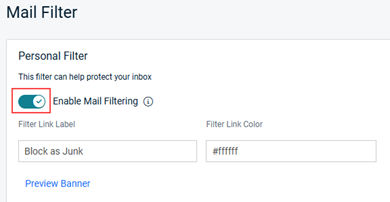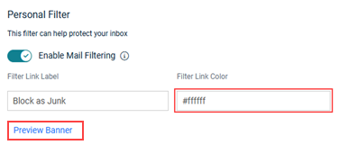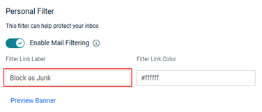 If desired, in the Filter Link Label field, edit the default text. When a user clicks this link in the email banner, future emails from this sender will be blocked.
