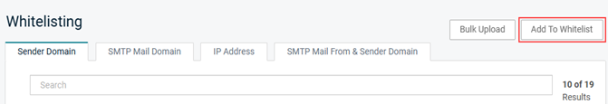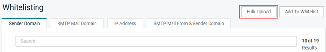 The Whitelisting page includes a tab for each type of whitelisting. Selecting a tab lists its existing whitelisting entries. You can upload multiple entries at once with the Bulk Upload button or add entries separately using the Add to Whitelist button. Find specific entries using the Search box.