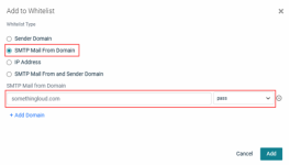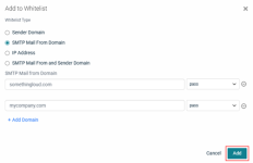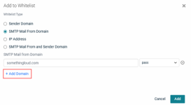SMTP Mail Domain: The SMTP mail from domain is the domain specified during the SMTP transaction in the MAIL FROM section of the SMTP envelope. This option whitelists a combination of the sender domain and an SPF value. Processing will be skipped for inbound emails whose SMTP MAIL FROM domain and the SPF value match the configured values.