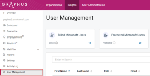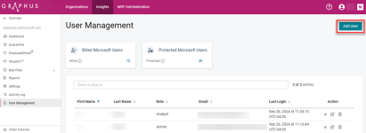 Graphus users can be added at the MSP level and the organization level. Users added at the MSP level have global access to all the MSP’s organizations in Graphus. Whereas, users added to a specific organization have access to that organization only and do not have access to MSP level functionality. Note that the same organization user cannot be added to multiple organizations.
