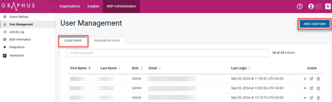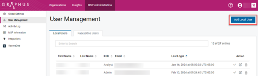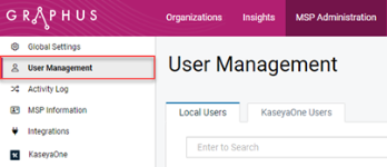 - For global user: Click MSP Administration > User Management. The Local Users tab is automatically selected.