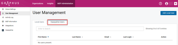 KaseyaOne users: The KaseyaOne Users tab displays only users created via Automatic User Access. When Automatic User Access is enabled on the KaseyaOne page, KaseyaOne users are required to access Graphus with KaseyaOne Unified Login.
