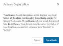 When adding a Google Workspace email domain in Graphus, a new modal will be displayed upon clicking the Activate button. The modal instructs you to complete the steps in the Graphus Activation Guide for Google Workspace and includes a link to the guide.![]()