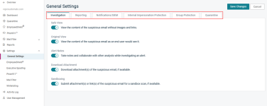 The General Settings page includes the following tabs for accessing common settings: Investigation, Reporting, Notifications/SIEM, Internal Impersonation Protection, Group Protection, and Quarantine Folder.![]()