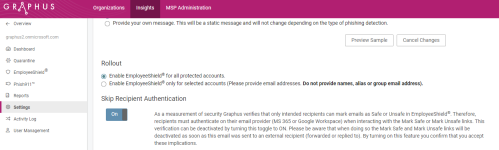 - As a security measure, Graphus verifies that only intended recipients can mark emails as Safe or Unsafe in EmployeeShield®. Therefore, recipients must authenticate on their email provider (MS 365 or Google Workspace) when interacting with the Mark Safe or Mark Unsafe links. This verification can be deactivated by turning this toggle to ON. Please be aware that, when doing so, the Mark Safe and Mark Unsafe links will be deactivated as soon as this email is sent to an external recipient (forwarded or replied to). By turning on this feature, you confirm that you accept these consequences.